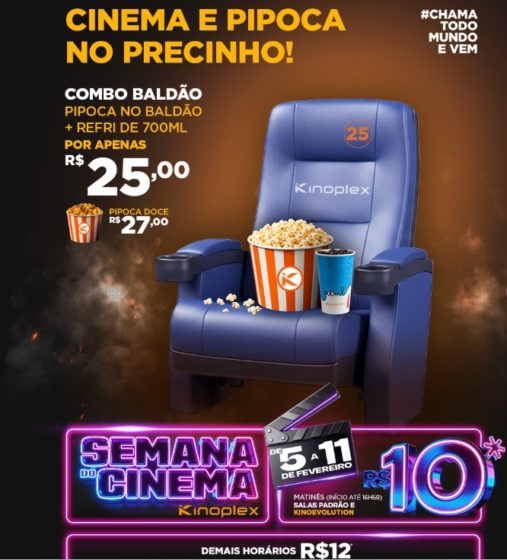 Além dos ingressos com valores reduzidos, o Kinoplex estendeu a campanha para a bomboniere. O Combo Baldão, que inclui pipoca no baldão e refrigerante de 700 ml, será vendido pelo preço promocional de R$ 25, ampliando a experiência para quem não abre mão do lanche clássico de cinema.