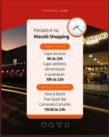 O Maceió Shopping funciona normalmente nesta terça-feita, 21 de abril, feriado de Tiradentes. Lojas, praças de alimentação e quiosques estarão abertos ao público a partir de 10 h até 22h.